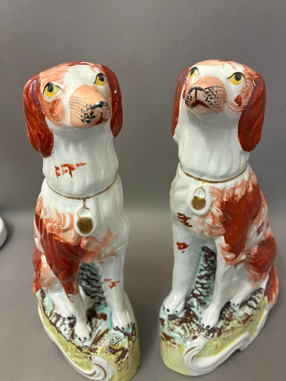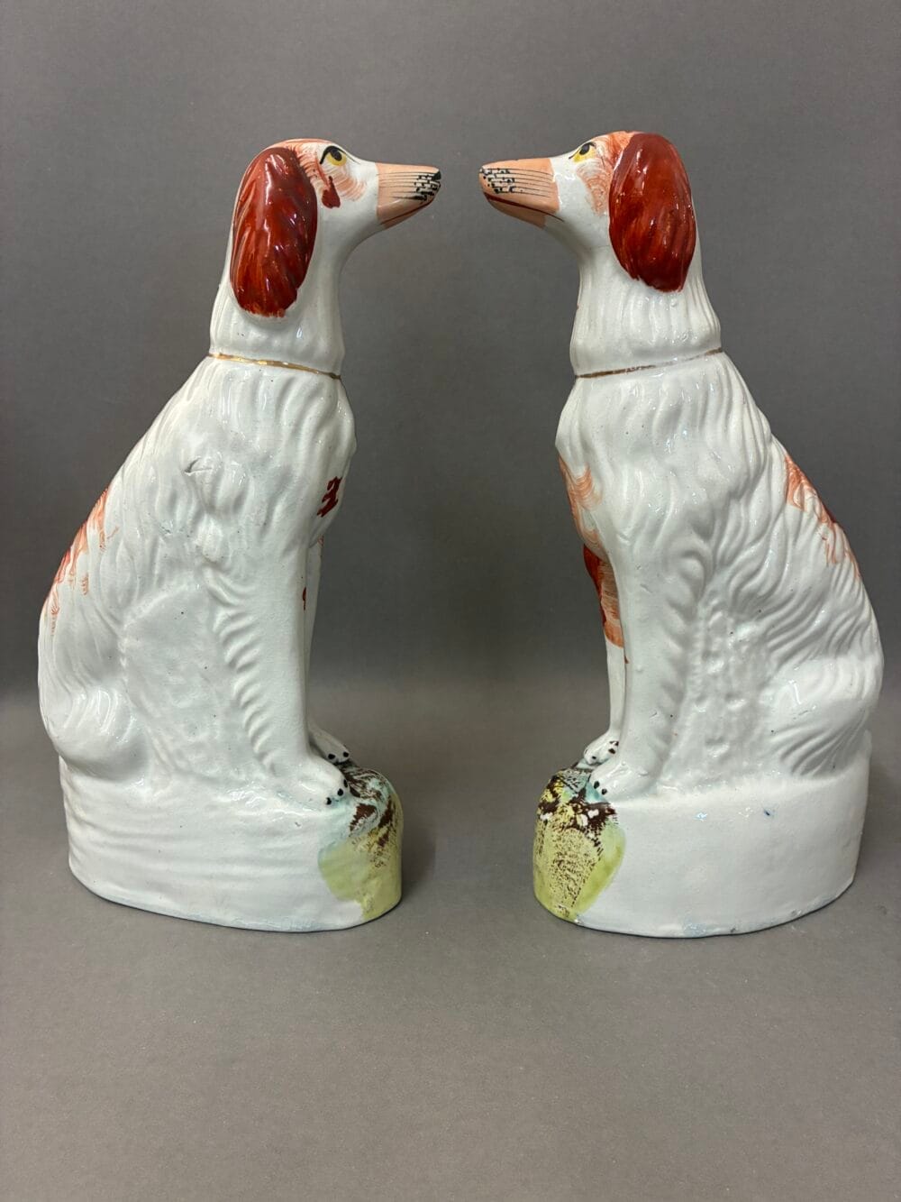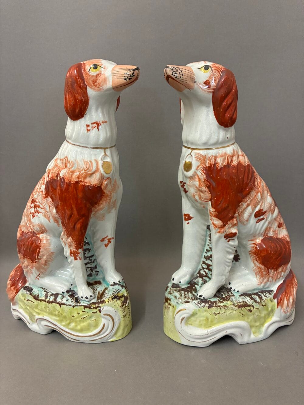 A wonderful tall pair of Victorian Staffordshire figures of Irish Setters, Circa 1850. The dogs are seated on scrolling bases with gilt decoration.