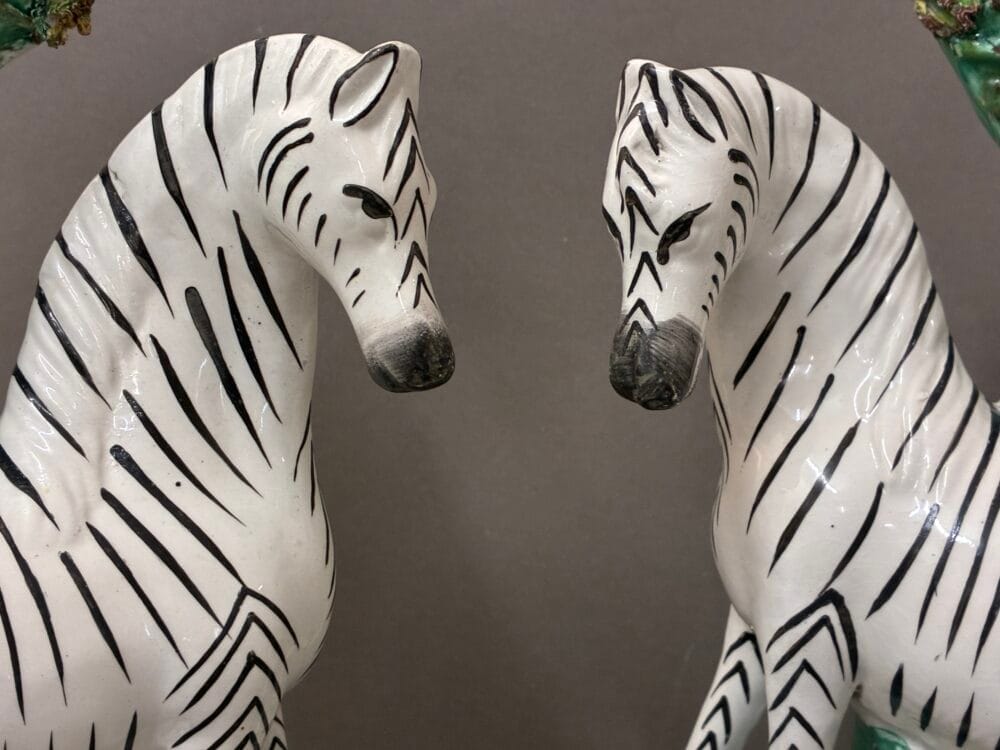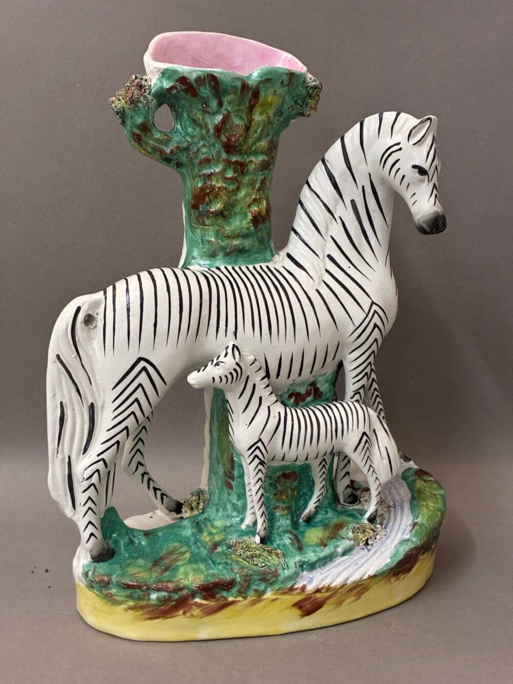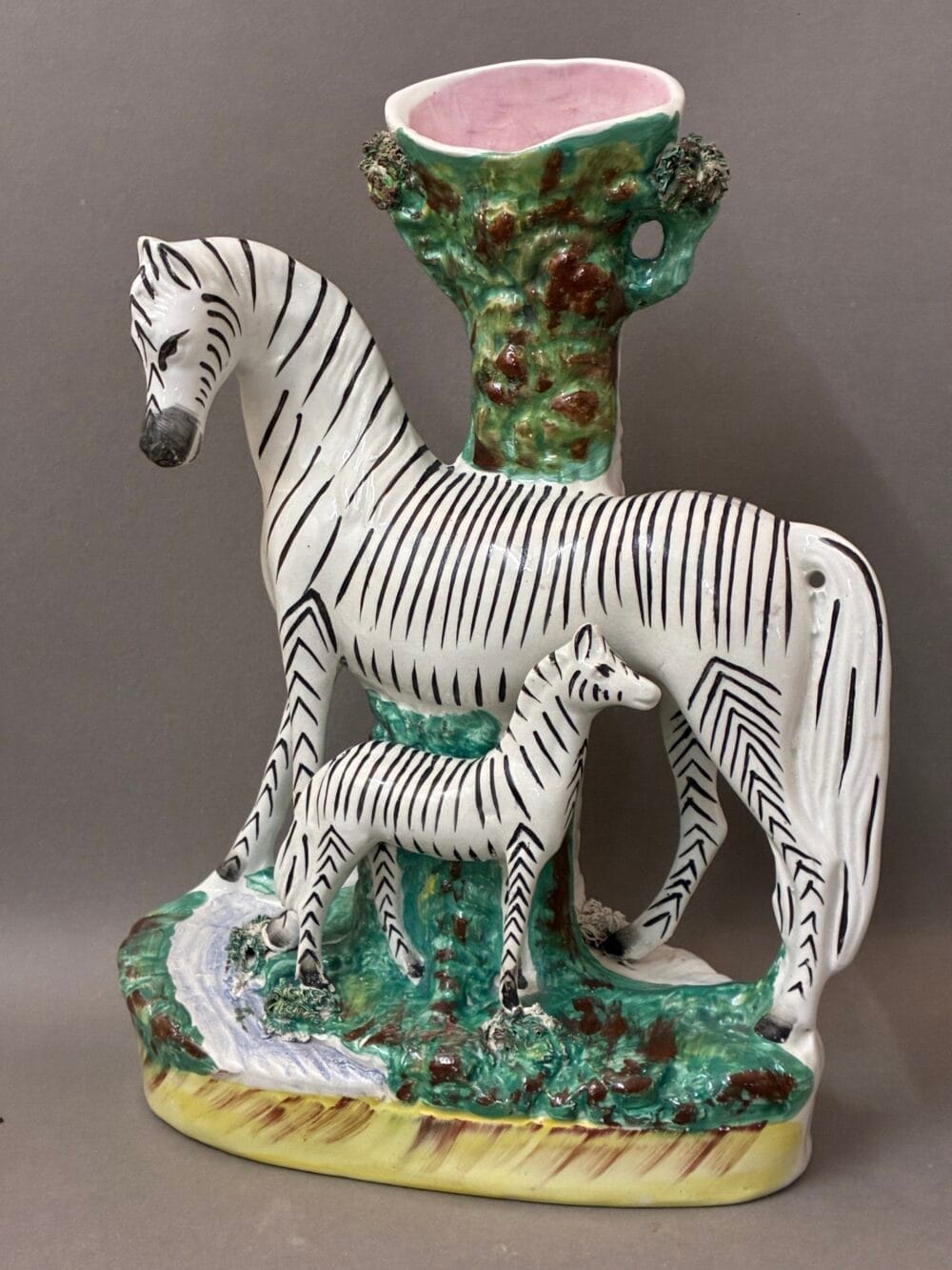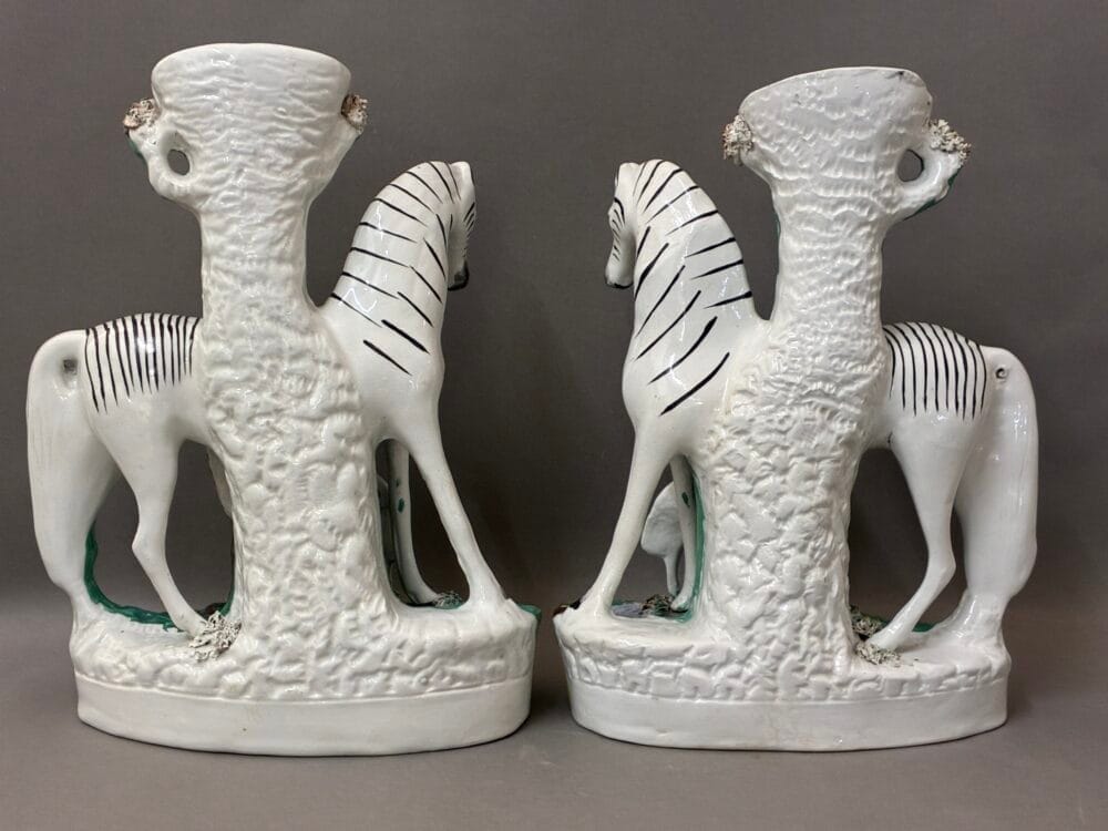 A wonderful rare pair of Victorian Staffordshire figures of zebras with standing foals, Circa 1860. The figures are modelled with spill vases, painted with pale pink interiors.